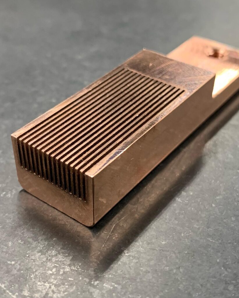 銅素材への放電加工溝幅0.5mm 長さ30mm 深さ6mmの溝を15本加工しました。溝幅が細く電極の加工が難しいのと、電極の摩耗が激しい銅素材への放電加工がなかなか苦労しました。 時間は掛かりましたが良い精度の品物が出来上がりました。 #型彫放電加工 #ワイ... -